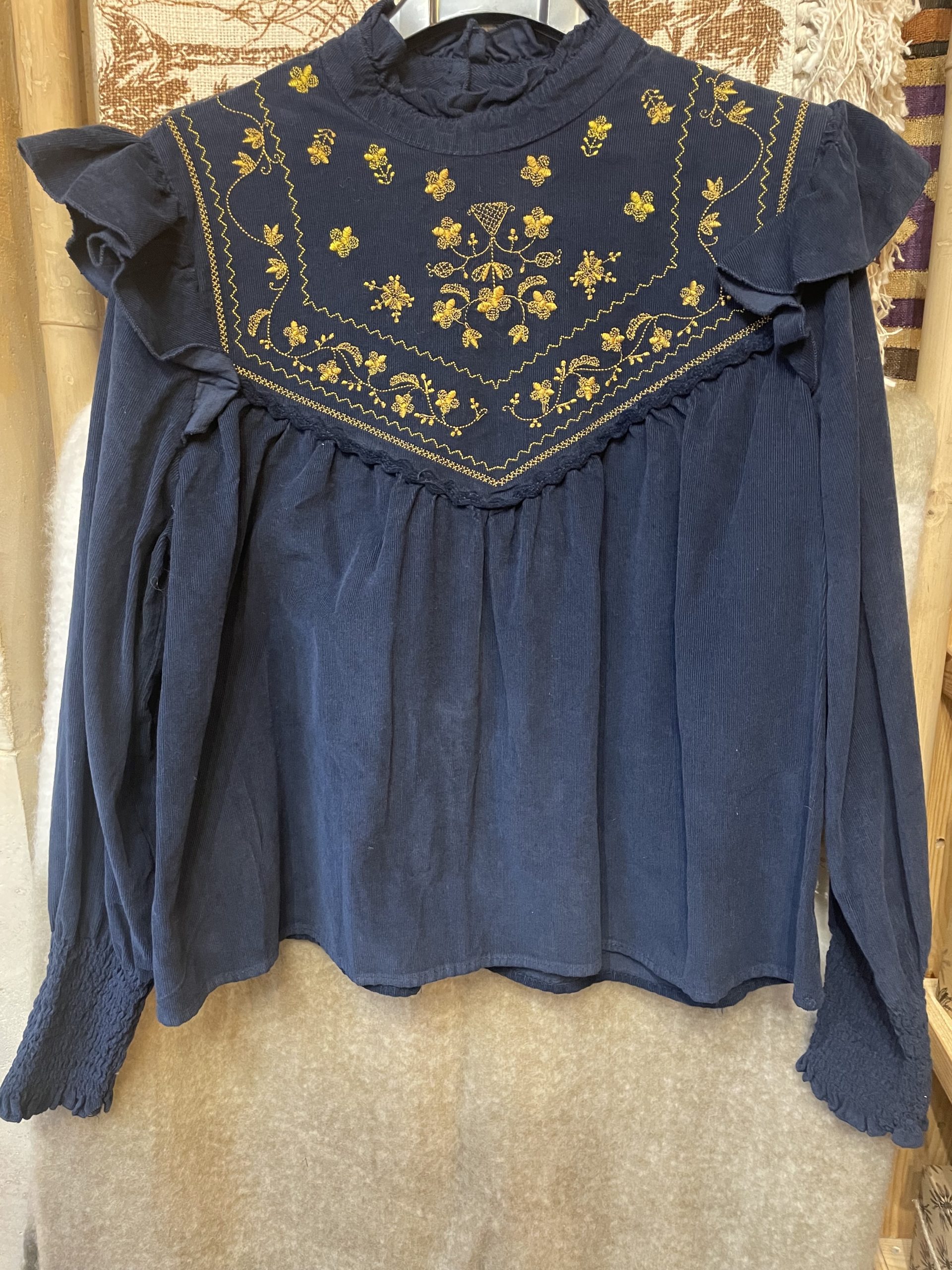 La blouse est brodée devant et derrière. Les broderies sont de couleur jaune.