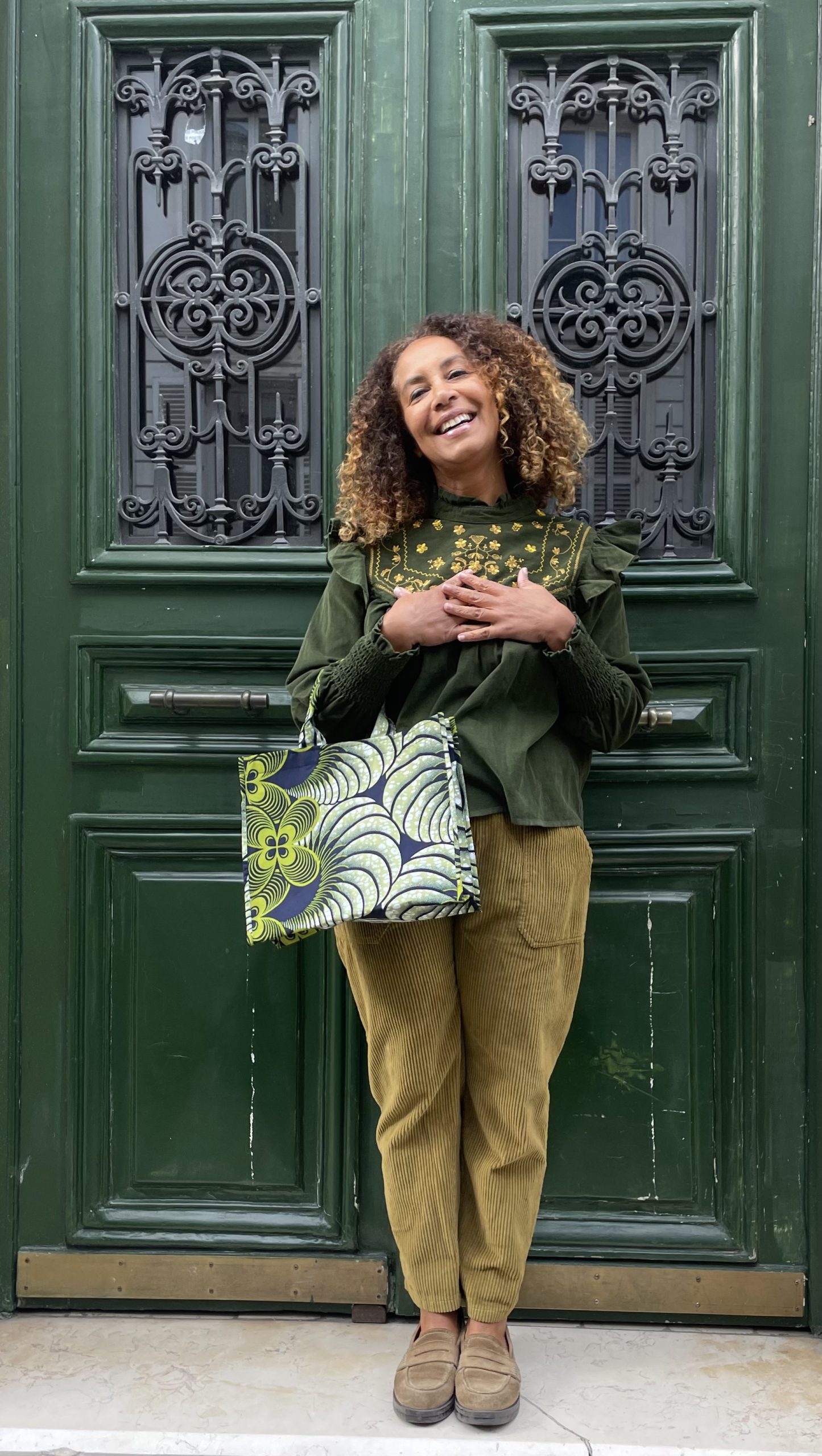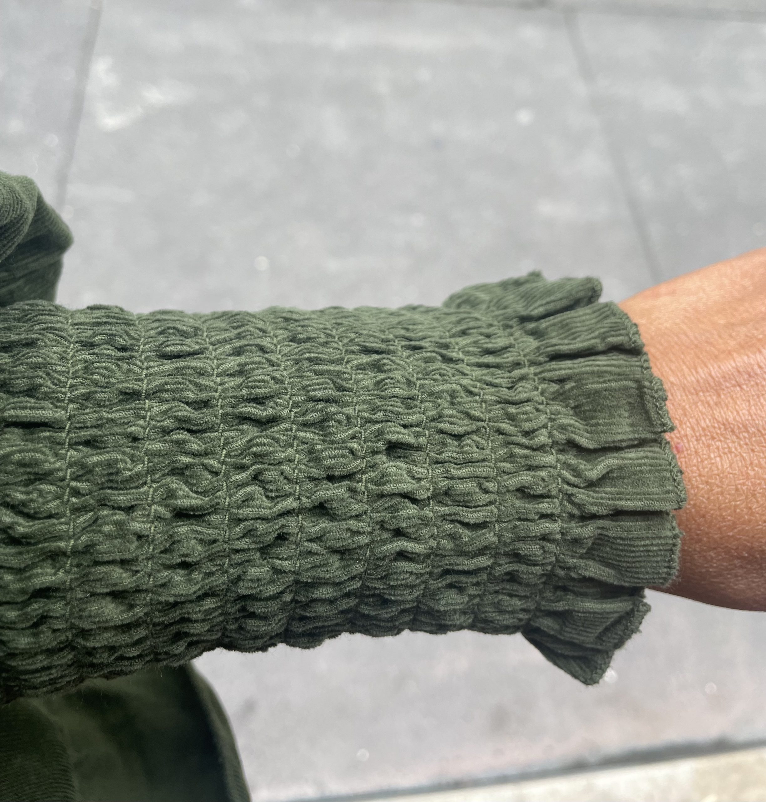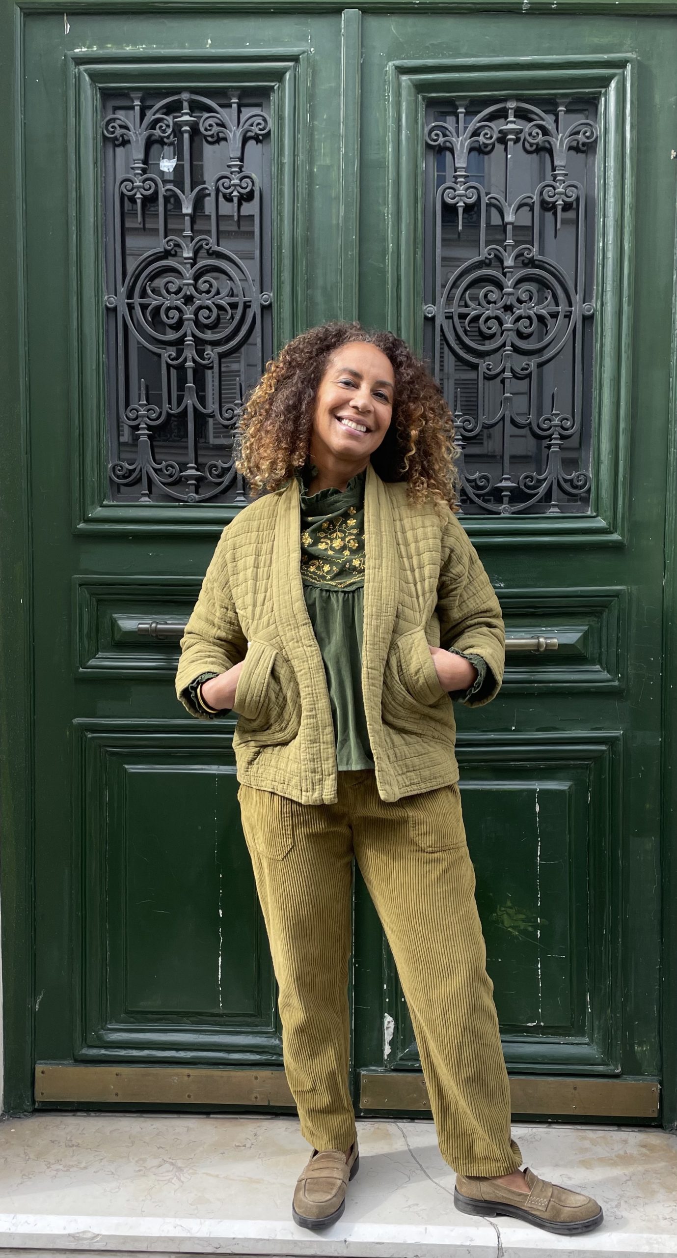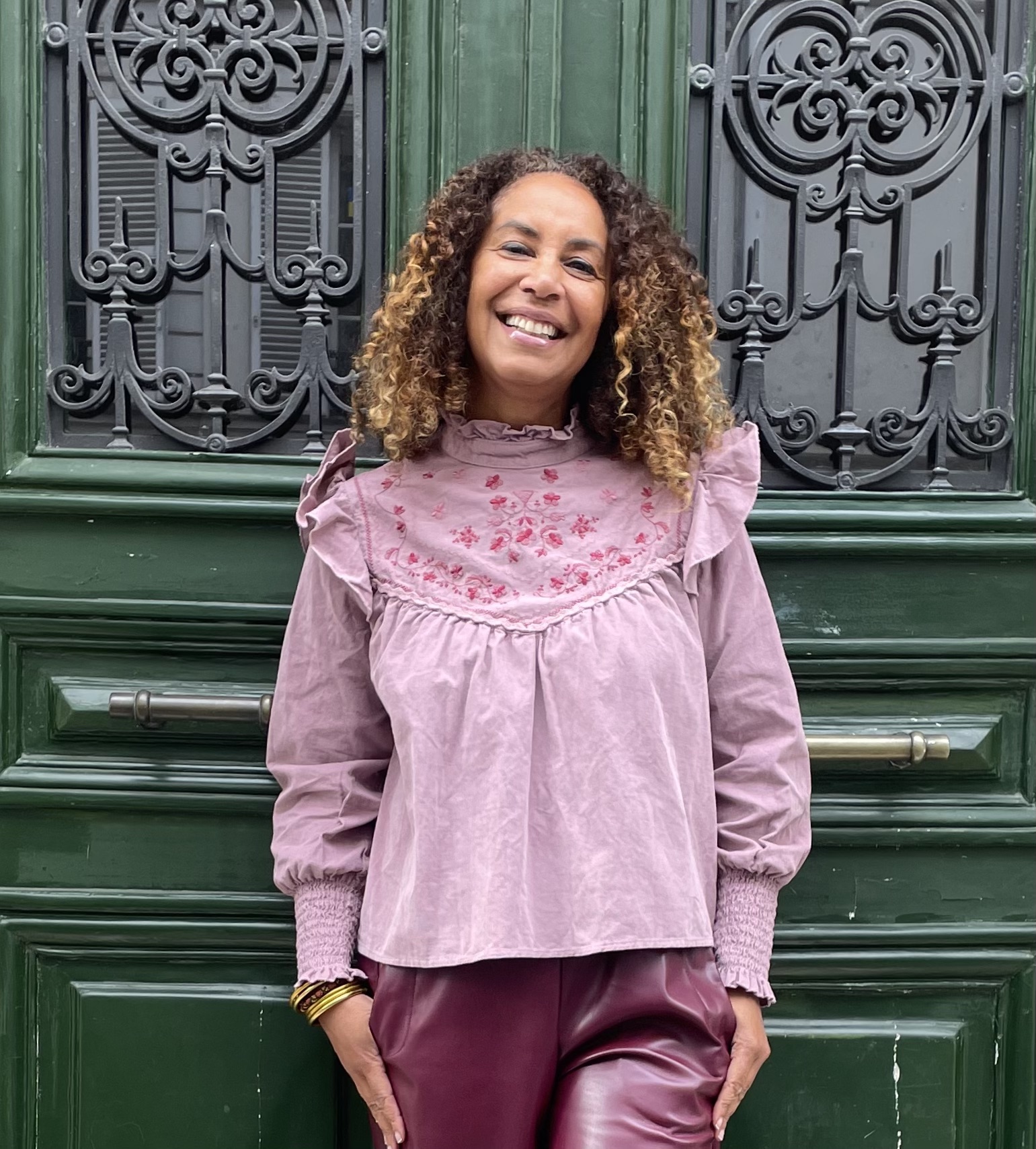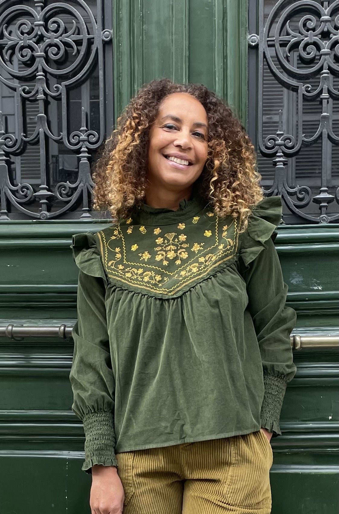 Cette jolie blouse en velours milleraies se porte aussi bien avec un pantalon qu’une jupe.