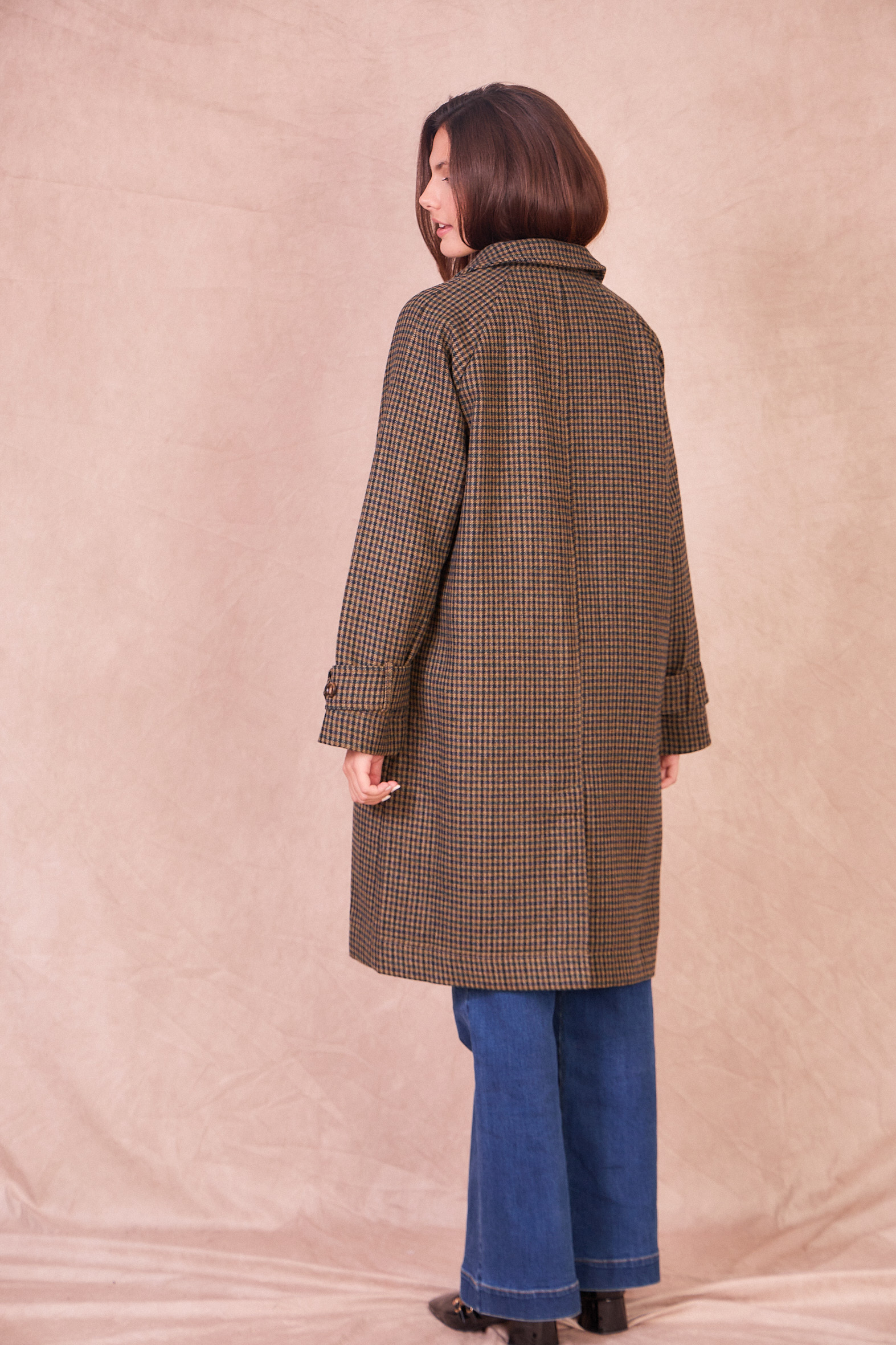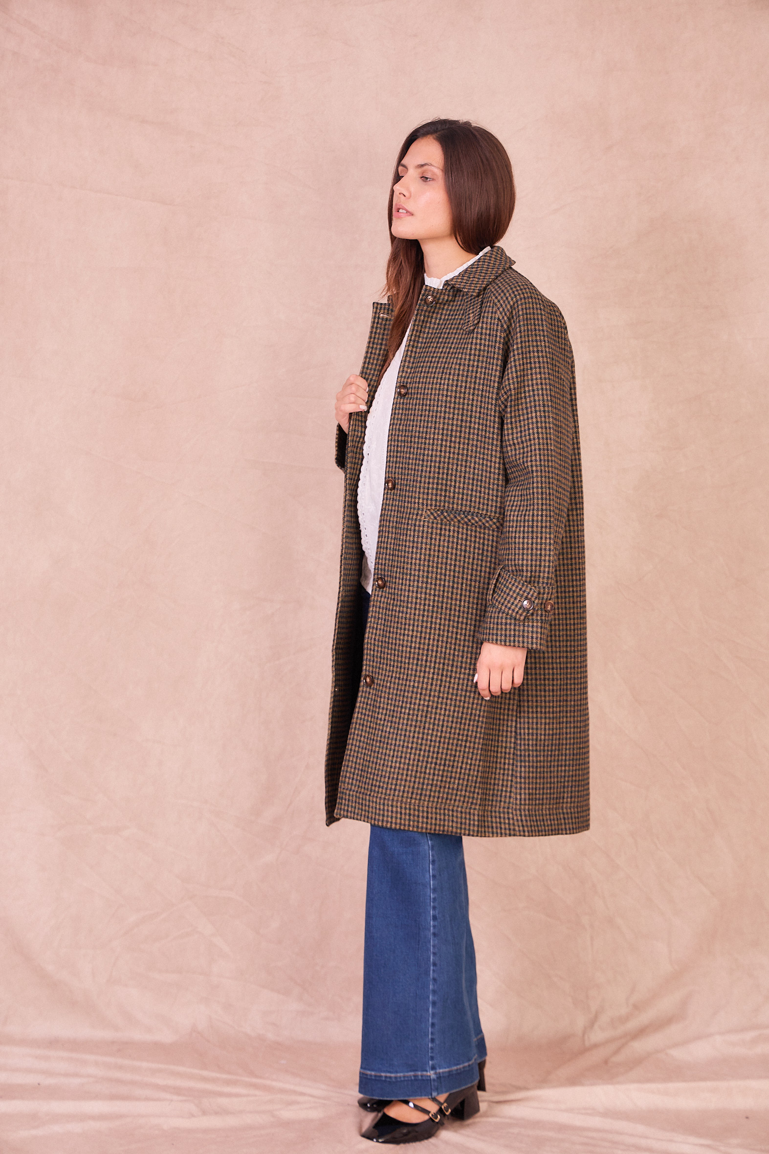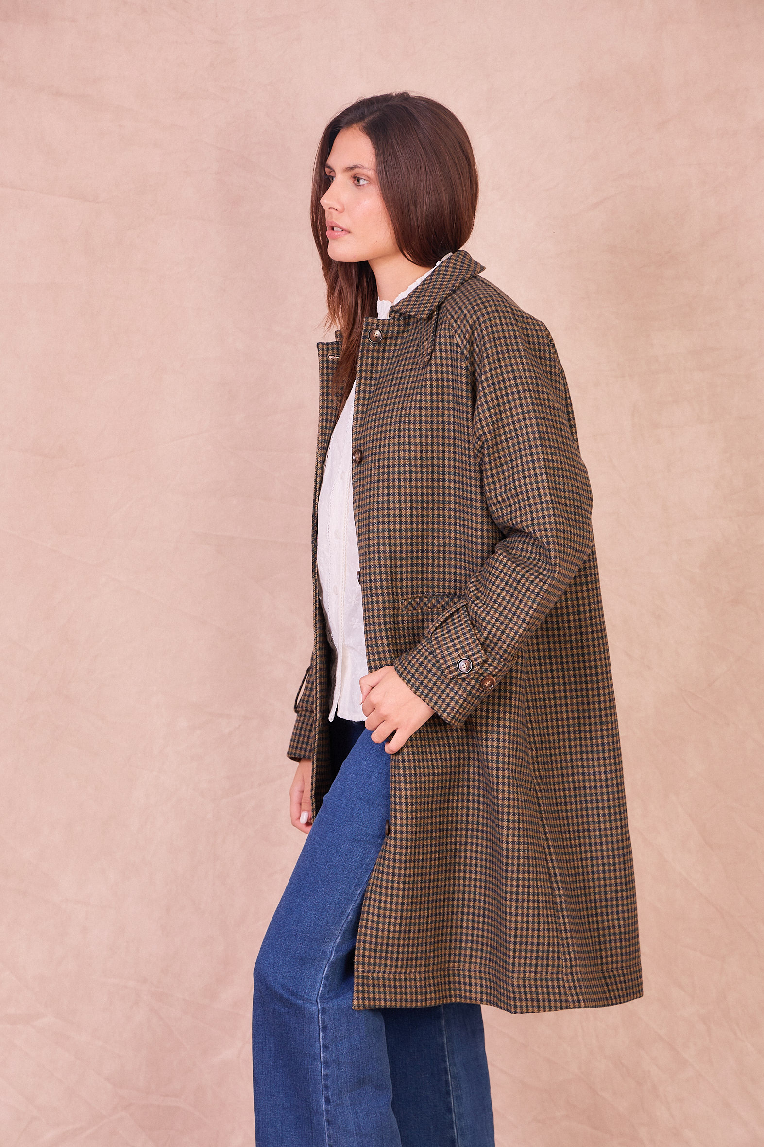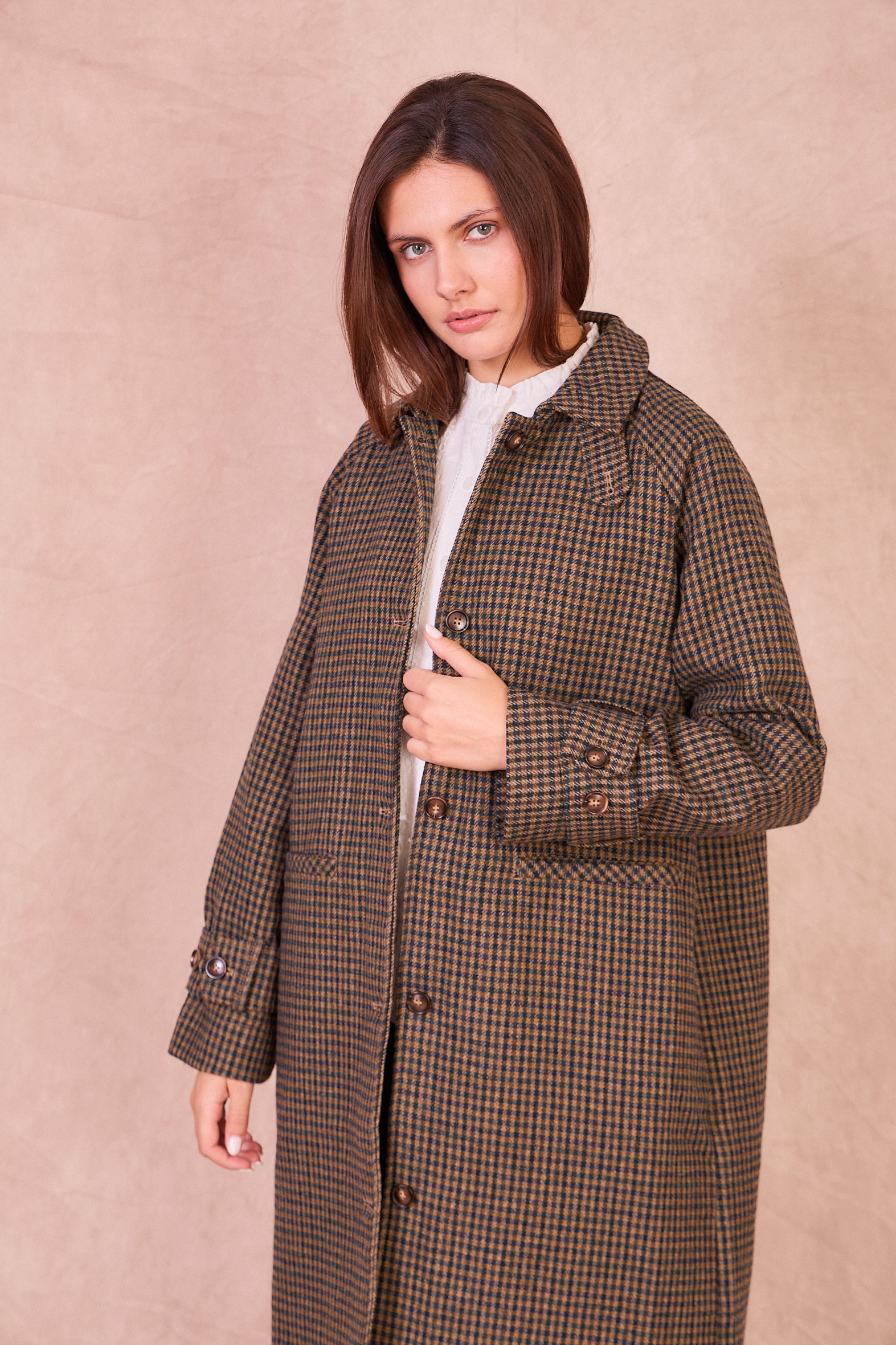 Gaston est un manteau long, coupe ample, motif à carreaux, col classique et emmanchures raglan. Fermeture boutonnée sur le devant.