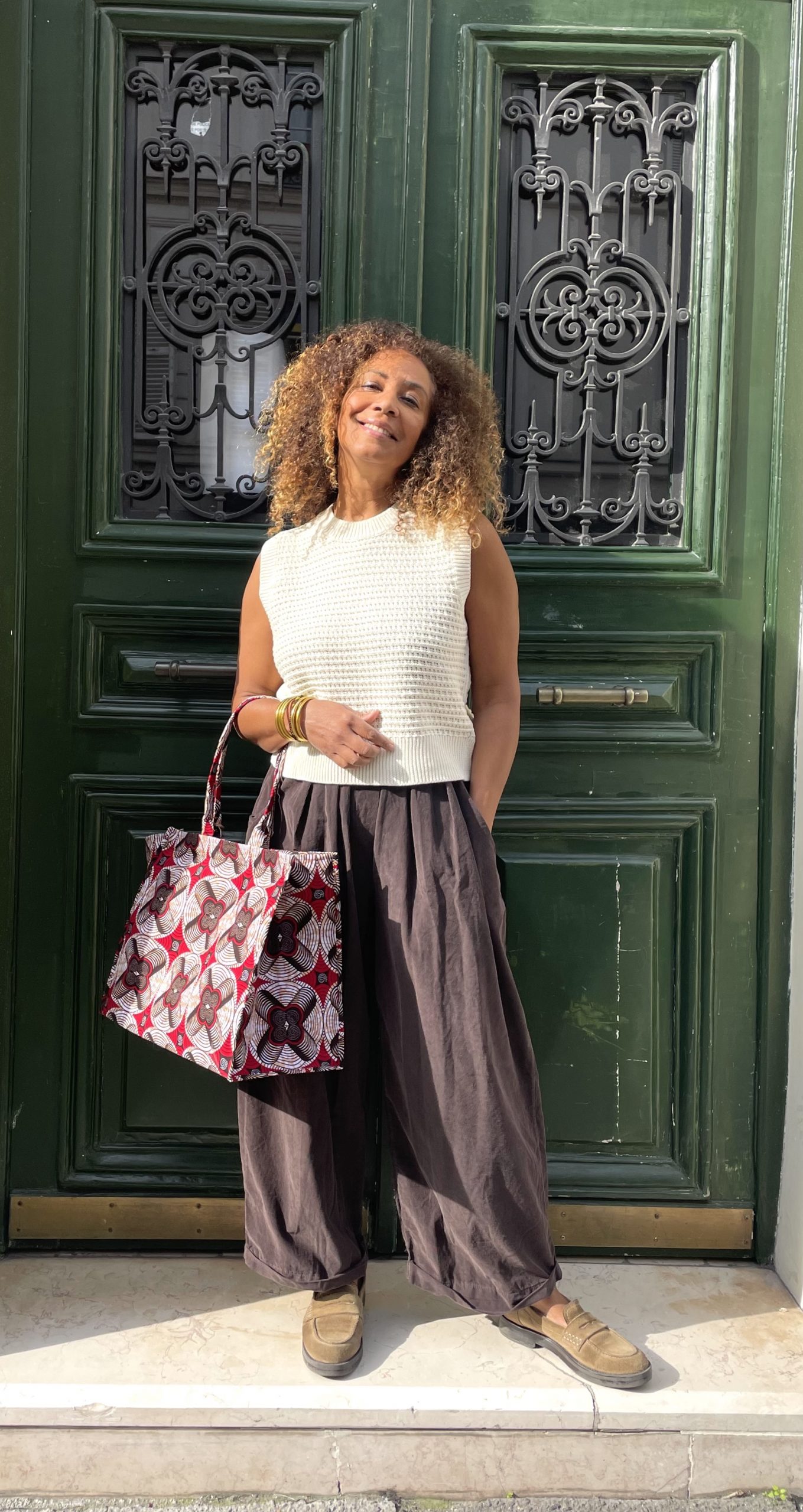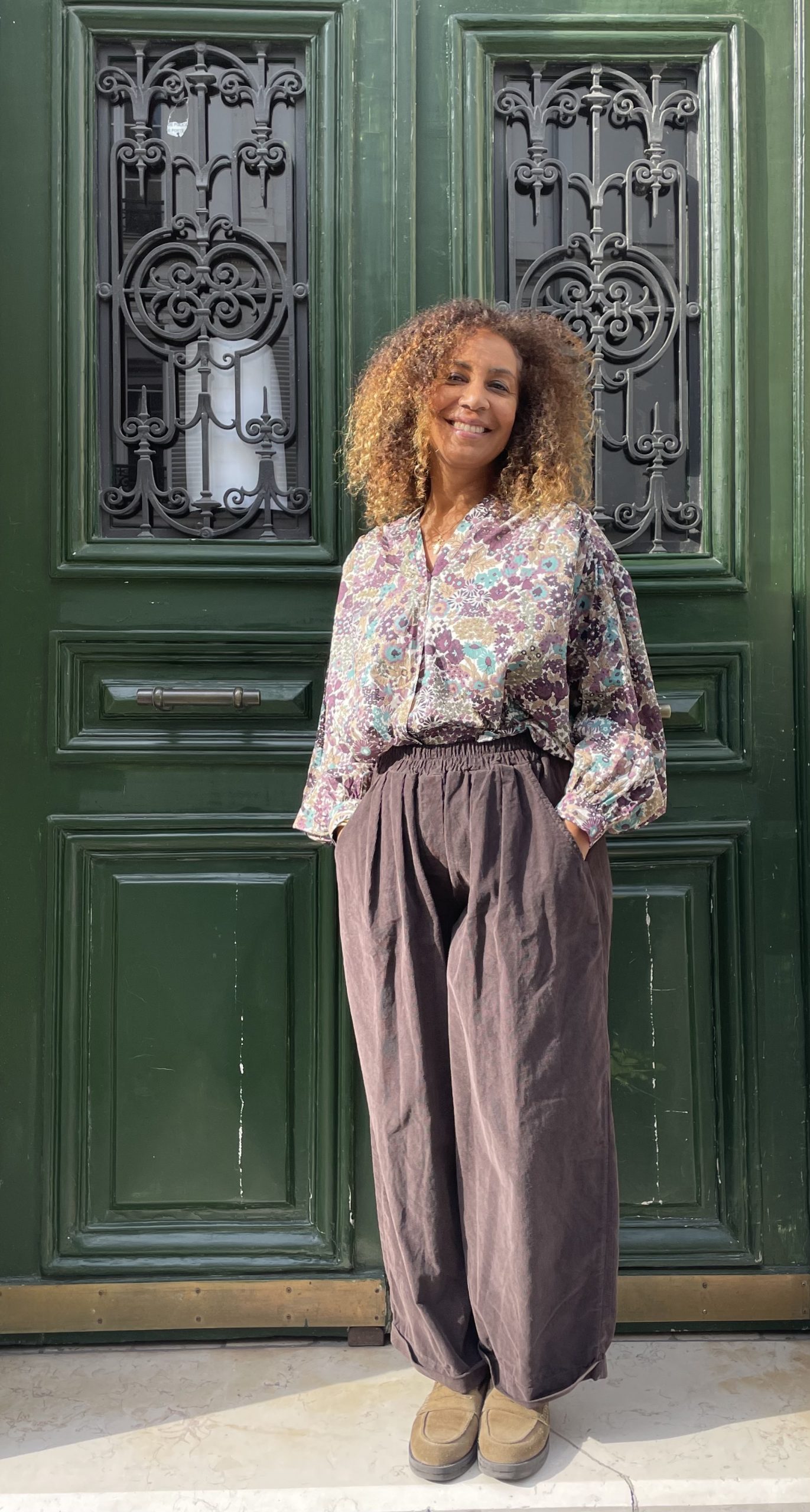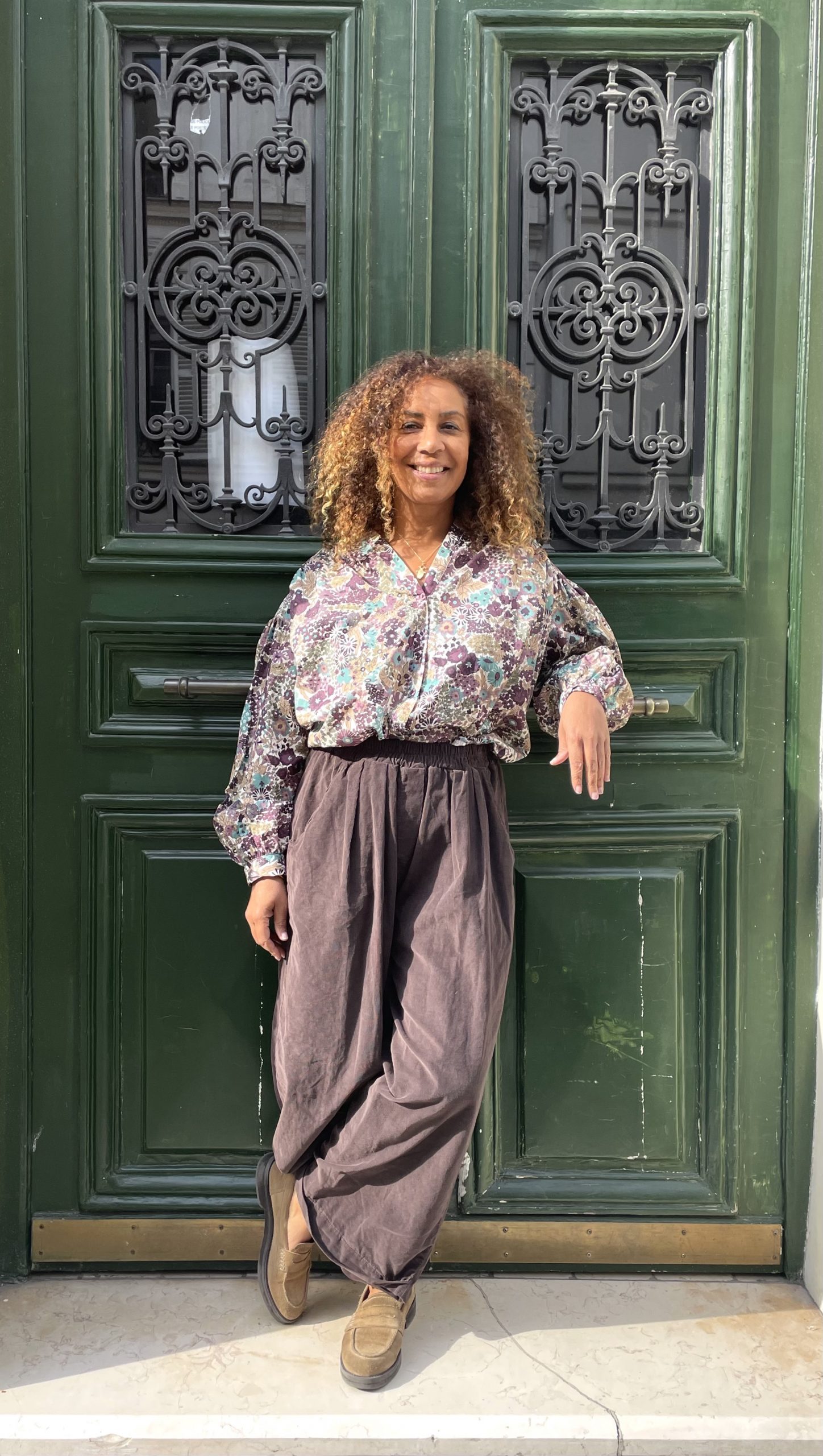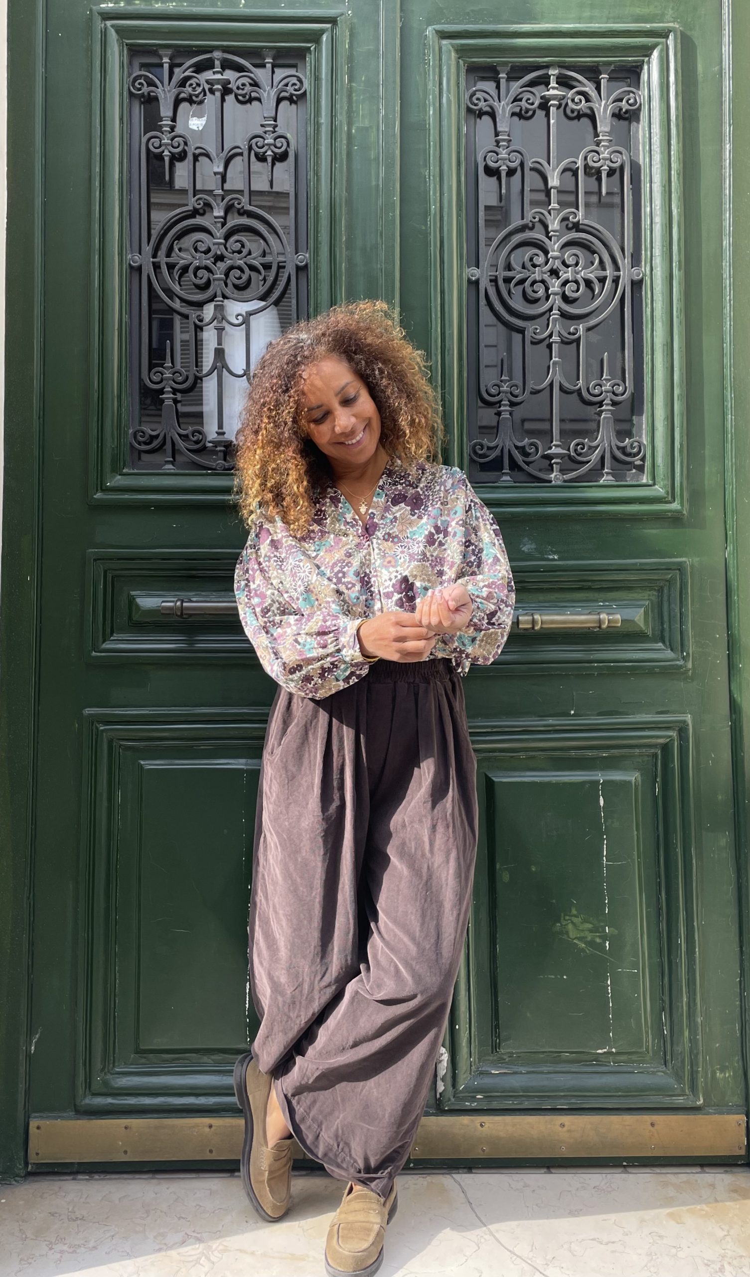 Le pantalon magique, extra large, en velours milleraies de chez Johanna Paris, vous donnera un petit look japonais.