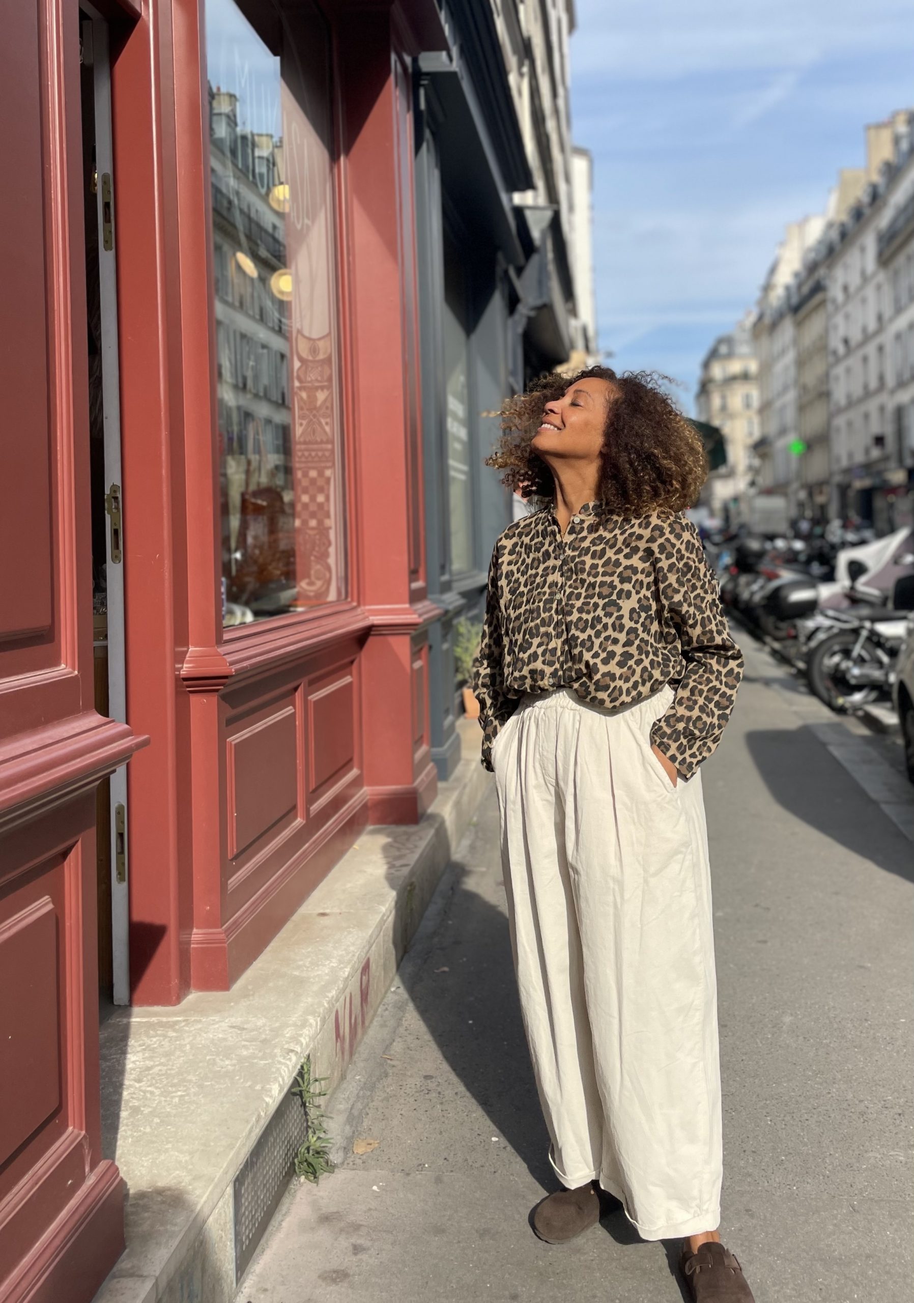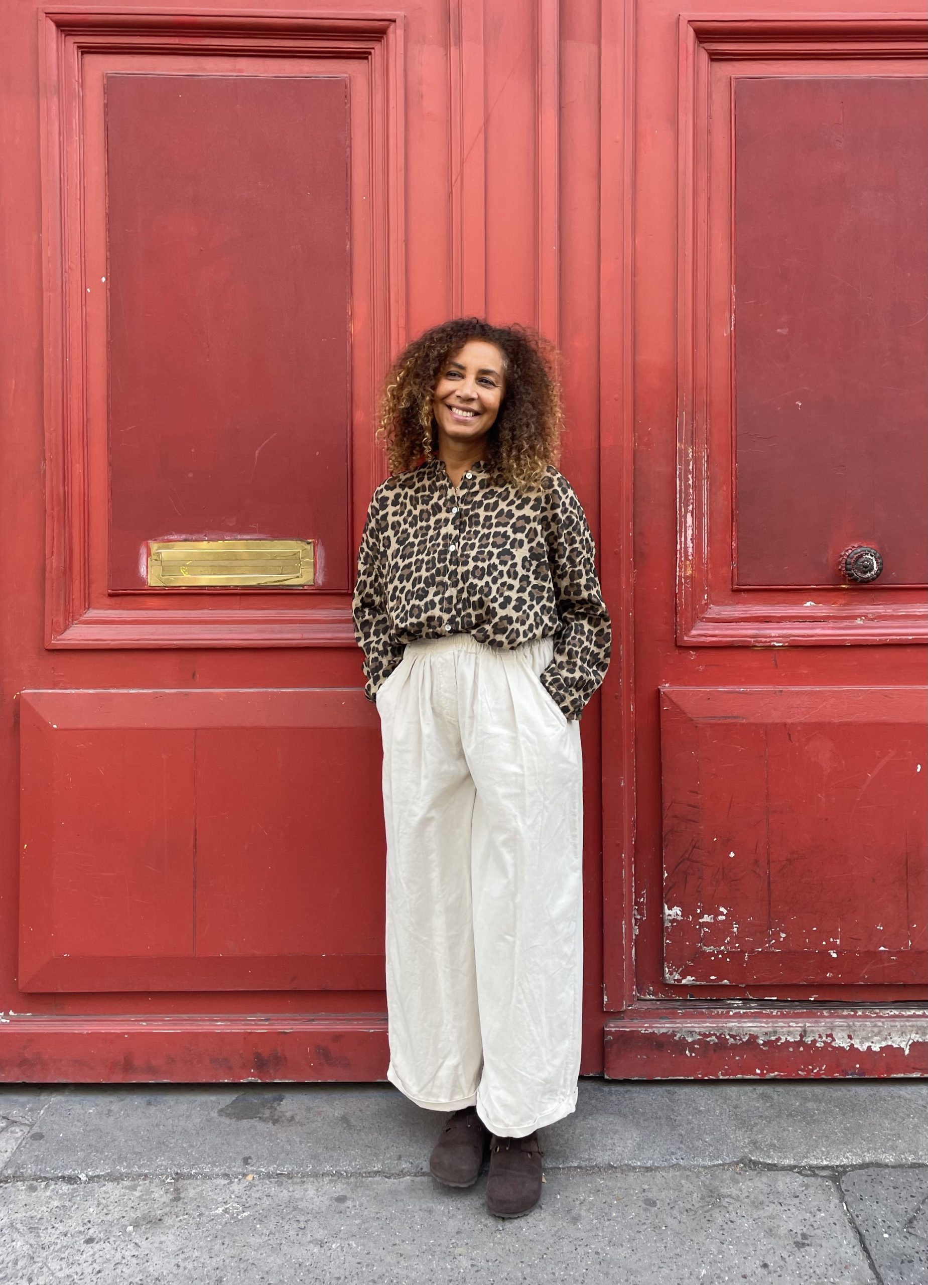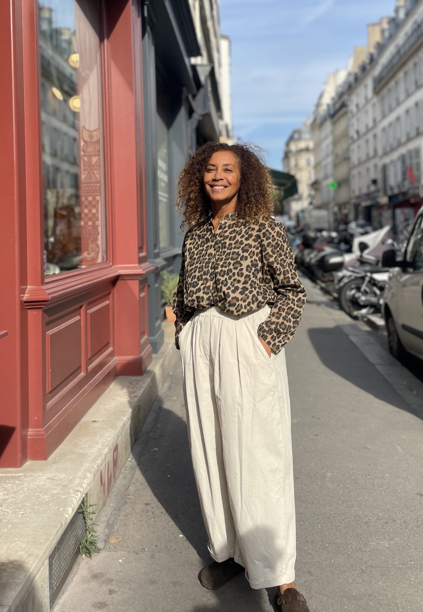 Le pantalon magique, extra large, en velours milleraies de chez Johanna Paris, vous donnera un petit look japonais.