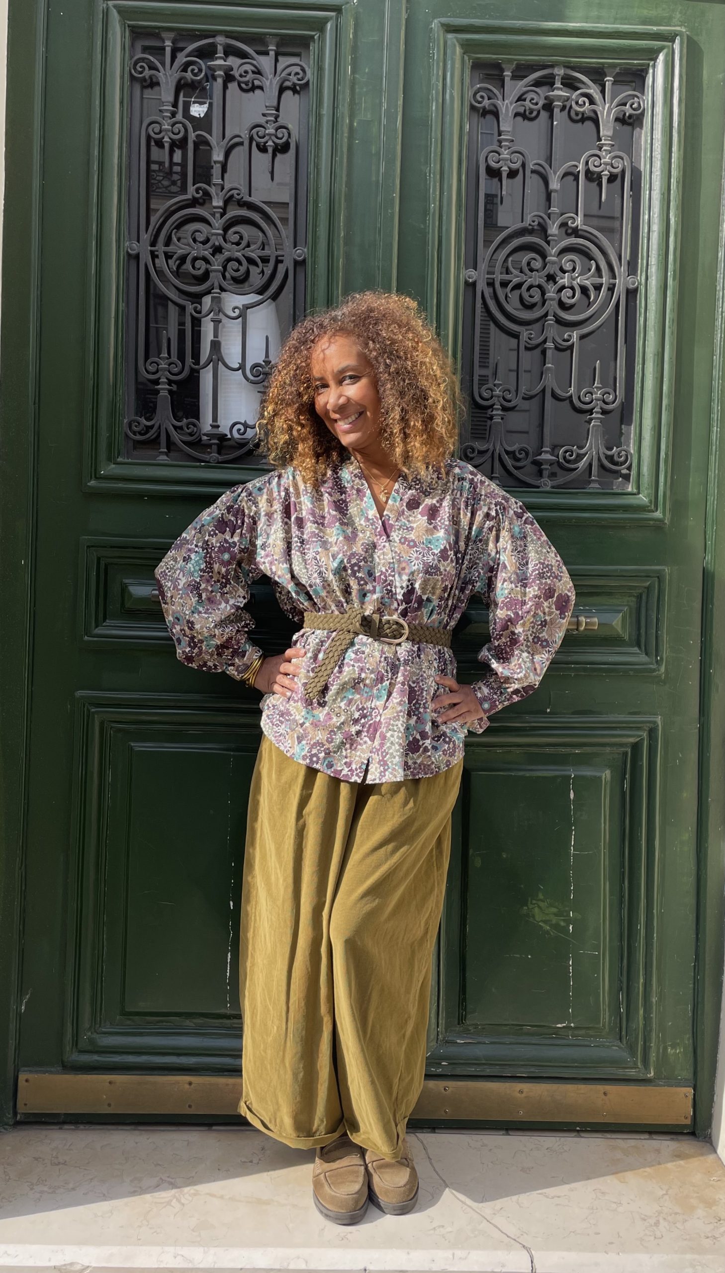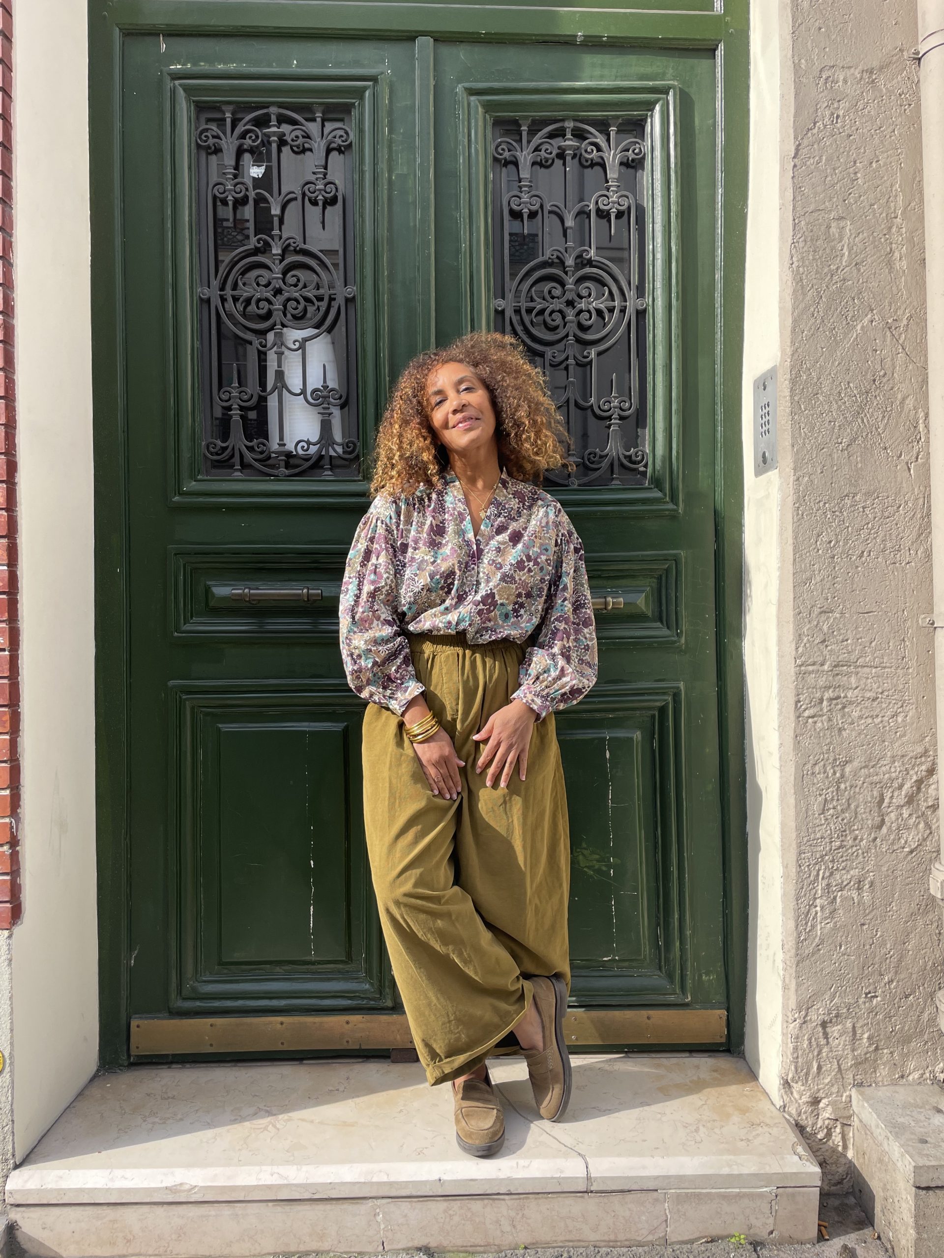 Le pantalon magique, extra large, en velours milleraies de chez Johanna Paris, vous donnera un petit look japonais.