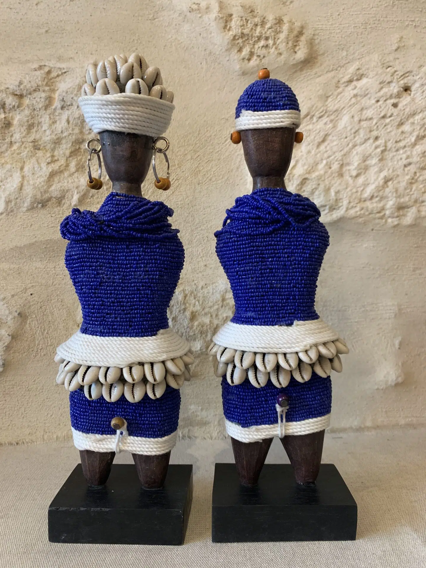 Cette jolie poupée Namji de fécondité, en bois, recouverte de perles, avec une coiffe en cauris, a été sculptée à la main, au Cameroun.
