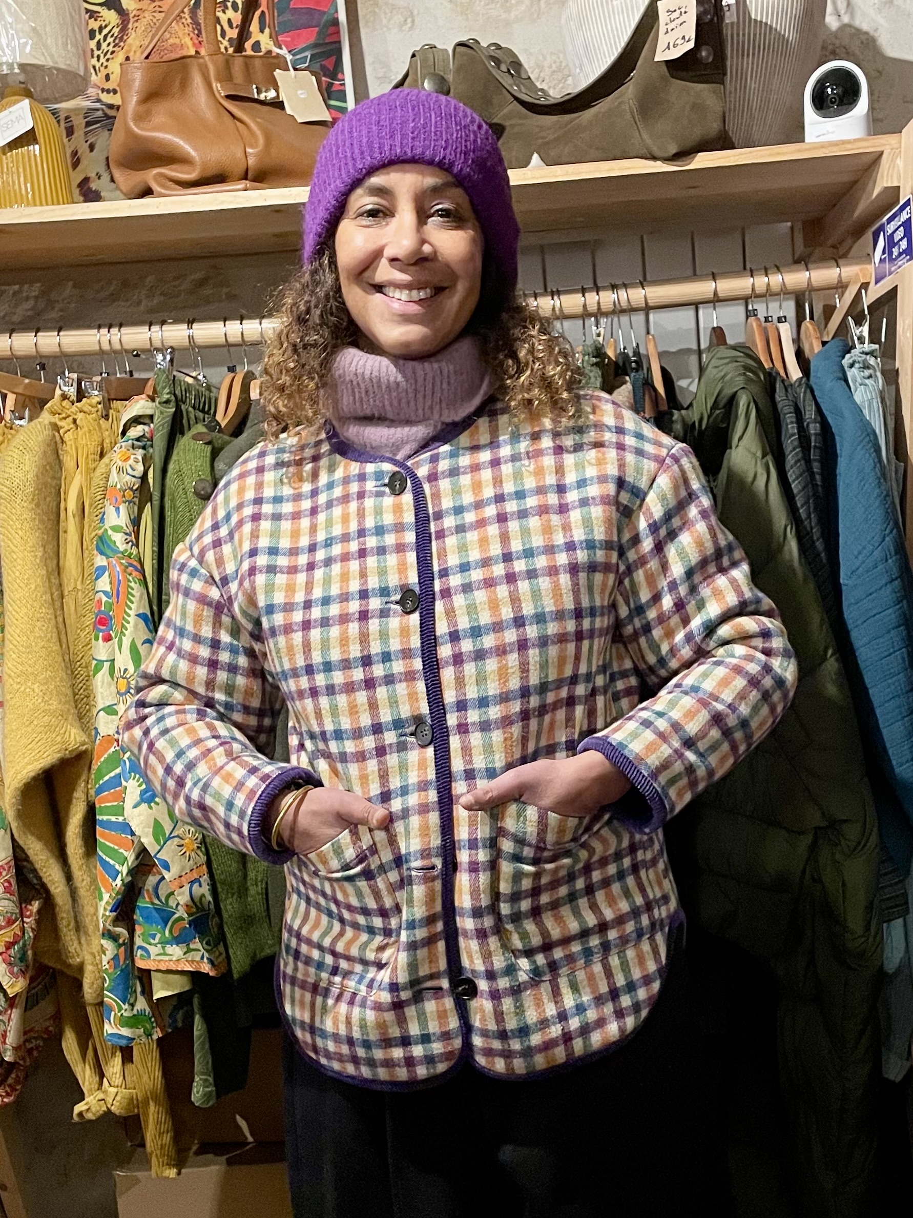Veste courte à carreaux avec une doublure moumoute de la marque française Johanna Paris.
